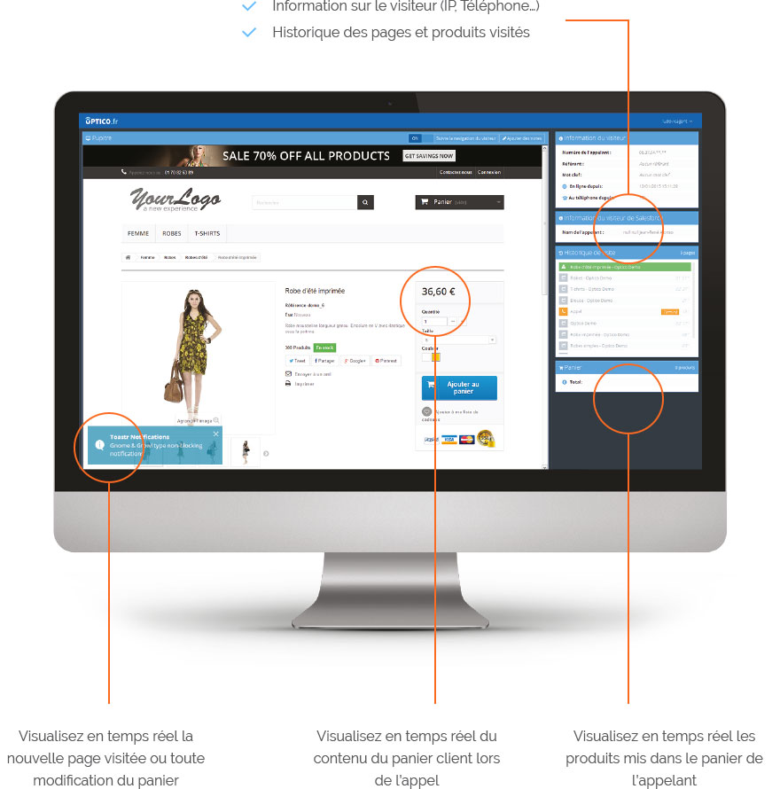 Lors d’un appel depuis votre site Internet, le conseiller traitant l’appel sera en mesure d’avoir une visibilité sur le parcours client et le contenu de son panier.